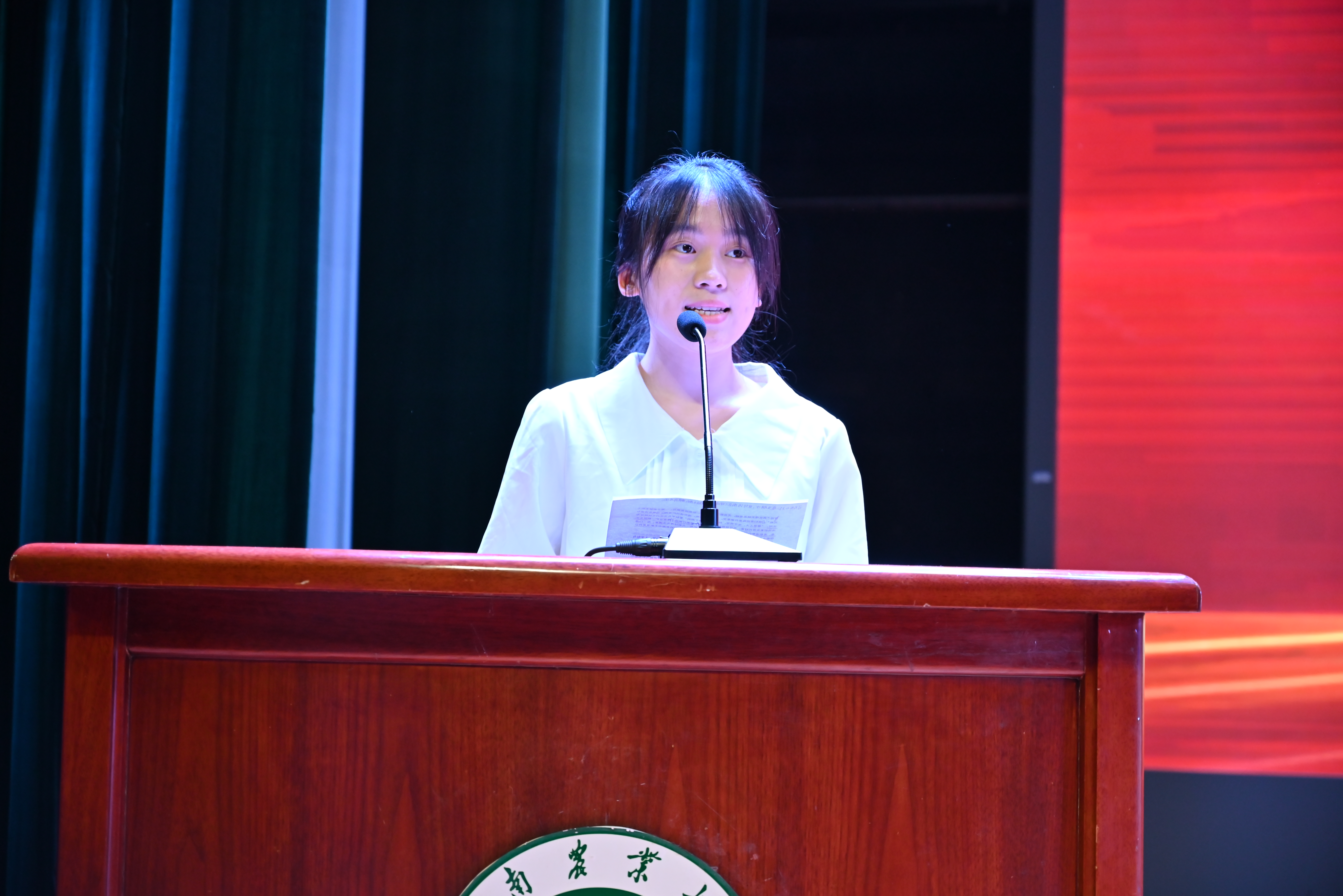 林学23级专业袁秋芃作为研究生新生代表发言。她表示要珍惜机会,潜心学问,以求真务实的态度,持之以恒地探索未知,承接农大学术传统,传递知识火炬。