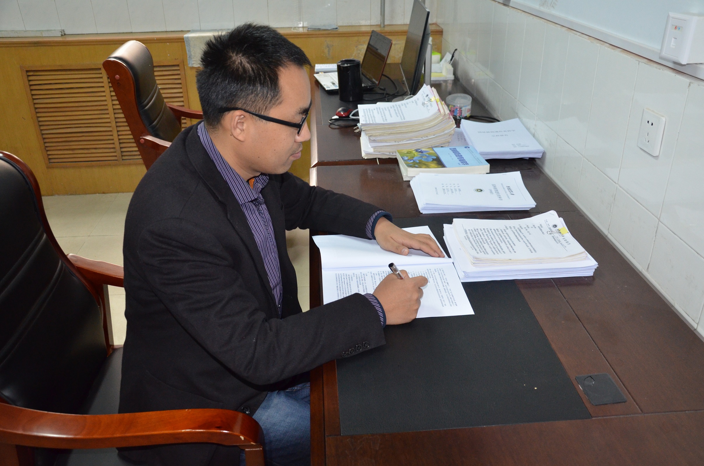 李永老师认真批改学生的实验报告