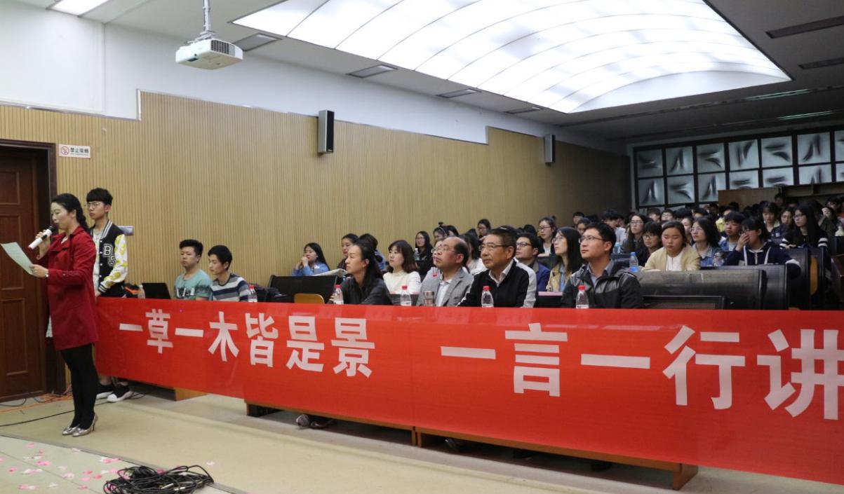 举行的2018年导游服务技能大赛决赛现场,林学系副主任何静领读倡议书,带领在场120余名师生郑重承诺“从我做起,从现在做起,展示文明风采,树立文明形象,共建文明社会”。